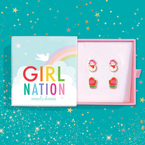 The perfect gift for little cuties! The Delightful Duet Gift Set includes two pairs of Holiday themed Cutie Stud Earrings in an adorable Girl Nation Gift Box.