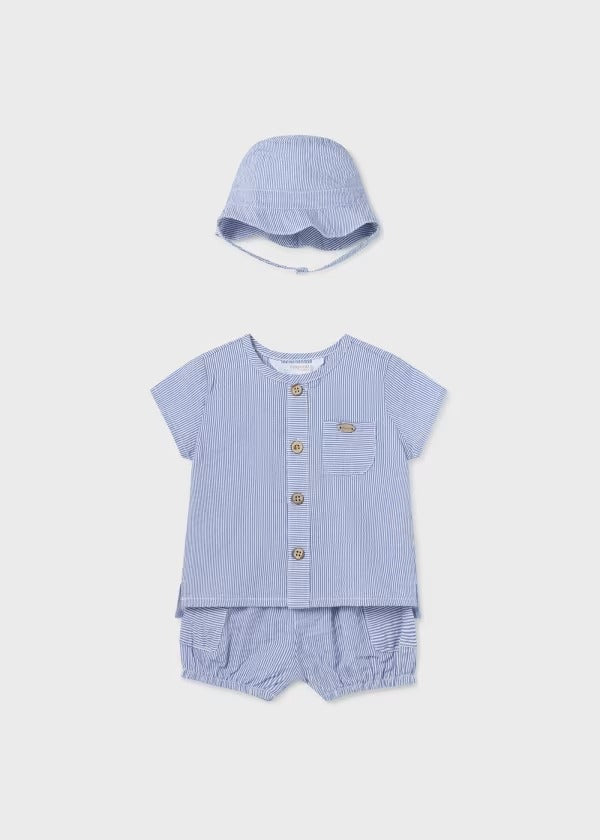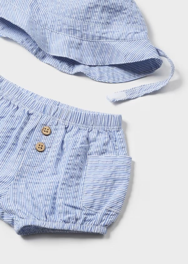 Dress your little one in effortless charm with this striped baby set with matching hat. Made from lightweight, breathable fabric, this outfit is perfect for warm-weather days. The short-sleeve button-front top features a sweet chest pocket detail, while the elastic-waist shorts ensure a comfy fit for all-day play. Finished with a coordinating sun hat, this set is as practical as it is adorable—ideal for strolls, family outings, or special occasions. Item 1207