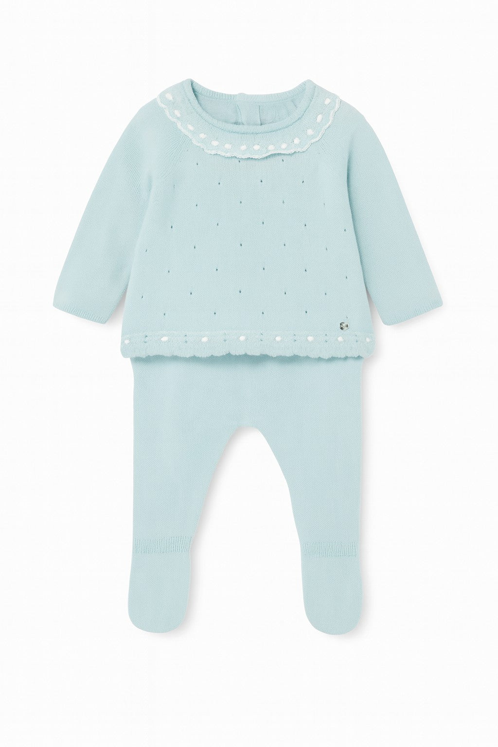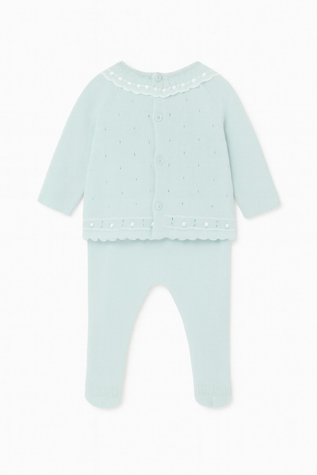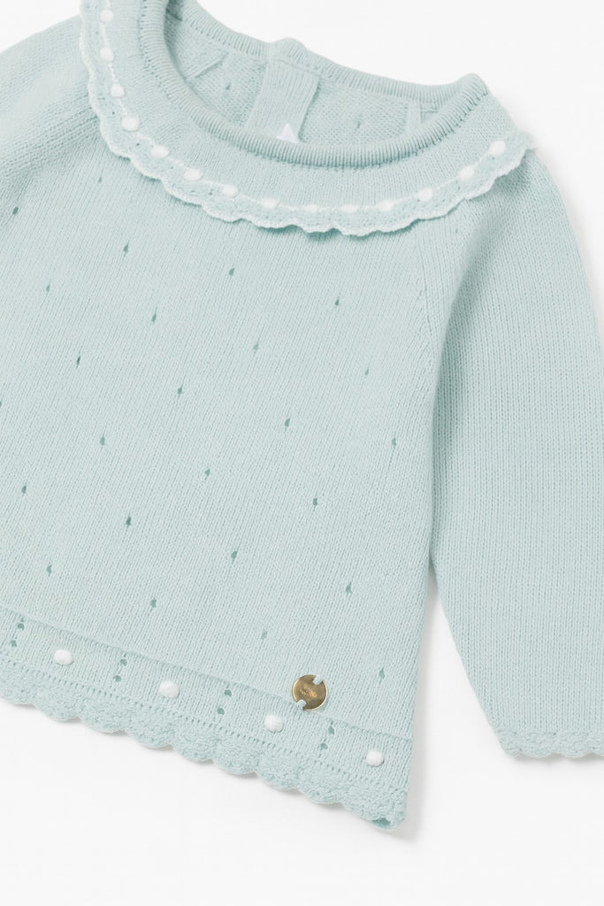 Sweater for newborn. Round neckline. Button fastenings down the back to allow the garment to be put on and taken off easily. Knitted fabric, soft and pleasant to the touch. Design with a decorative ruffle at the bottom of the item.