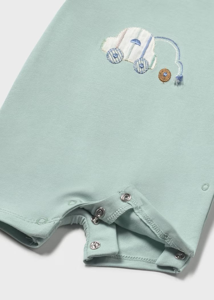 Original two-piece set for newborns. Short-sleeve newborn one-piece with a round neckline. Front closure with snap buttons. Snap buttons at the inseam for easy dressing. Made from soft, stretchy cotton fabric. Short-sleeve newborn one-piece with a round neckline. Wrap-style front with a full side opening secured by snap buttons. Snap buttons at the inseam for easy dressing. Item #1707