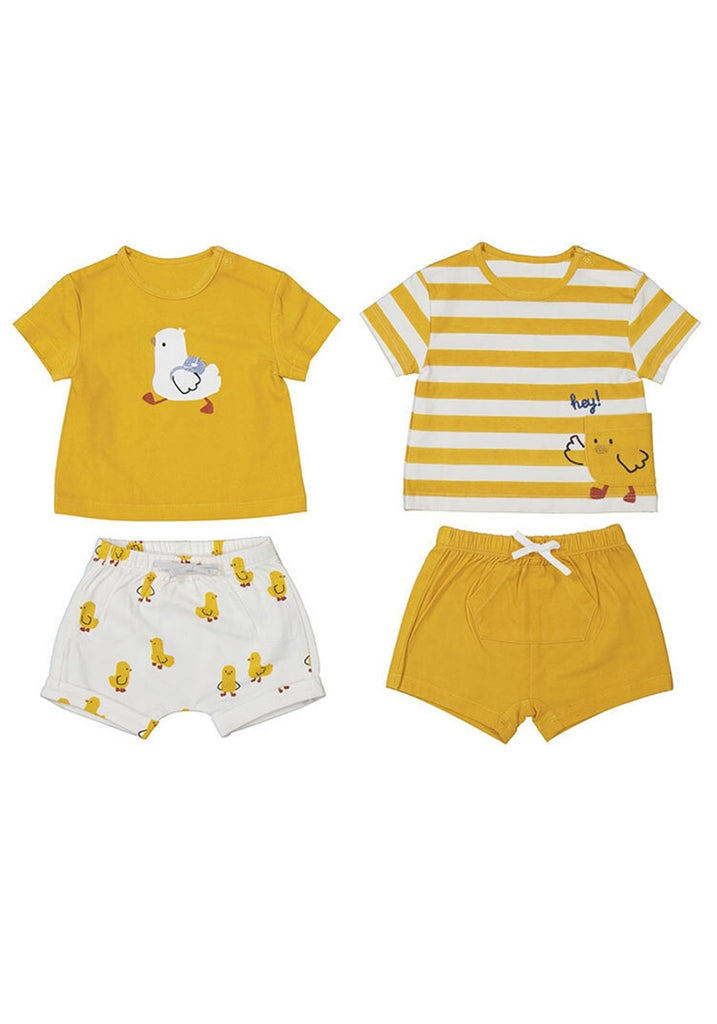 Get your little one ready for a fun day with the Mayoral Baby Boy 4 Piece Duck Tee and Short Set. This delightful set includes a comfortable round neck tee with playful duck and stripe details, and convenient snap button closure on the shoulder. The elasticated waist short adds even more comfort for your active bundle of joy. Item 1628