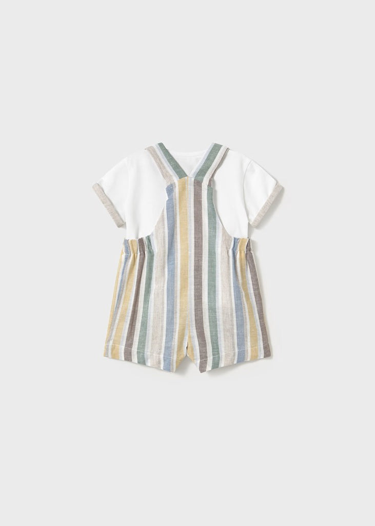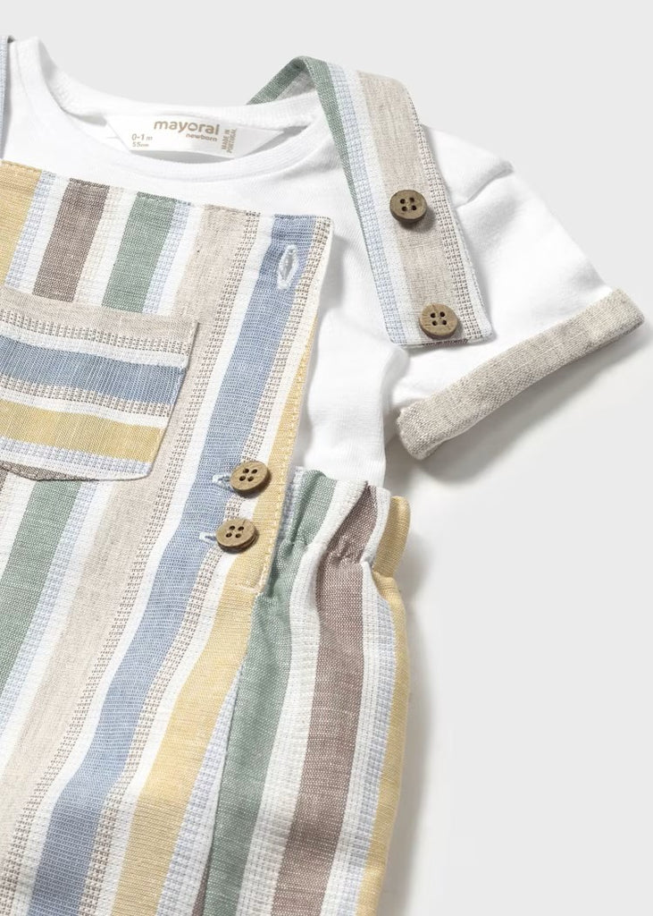 Short-sleeve T-shirt for newborns. Round neckline. Snap button at the neck for easy dressing. Made with sustainable European linen. Original dungaree pants for newborns. Snap buttons at the crotch for easy dressing. Button closures on straps and waistband for easy dressing. Elastic waistband. Functional front pocket. Striped pattern. Item #1621