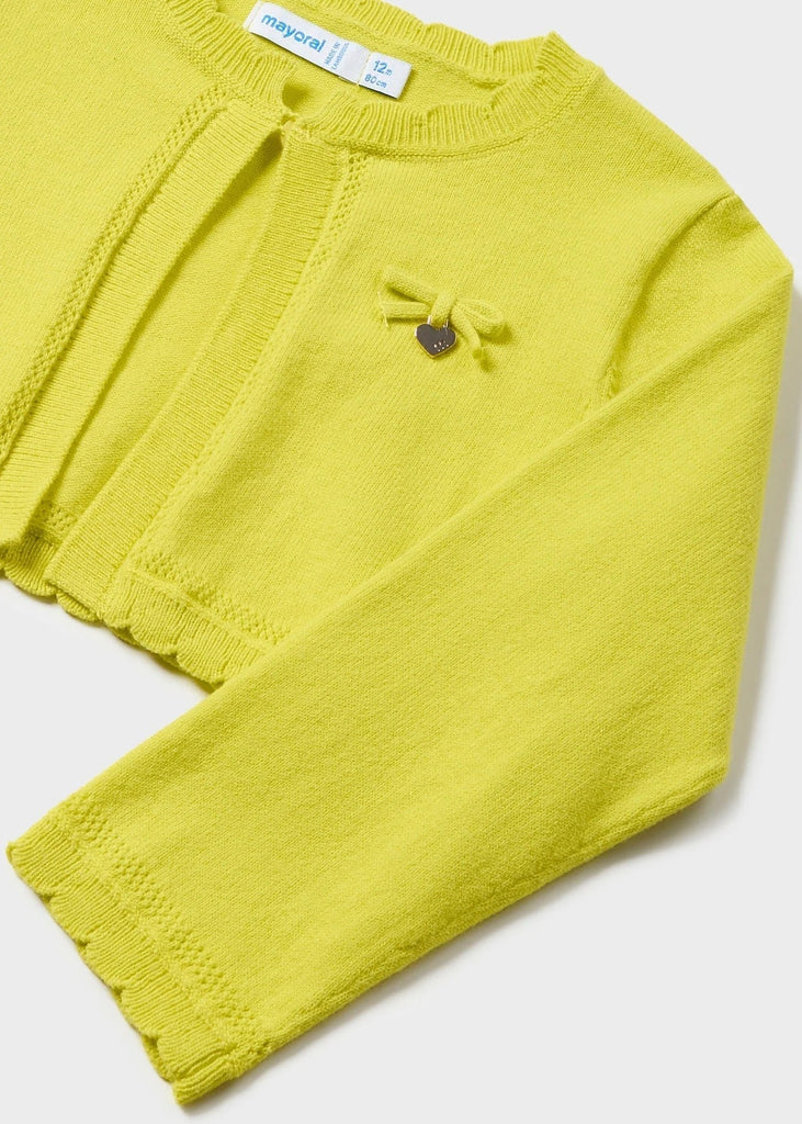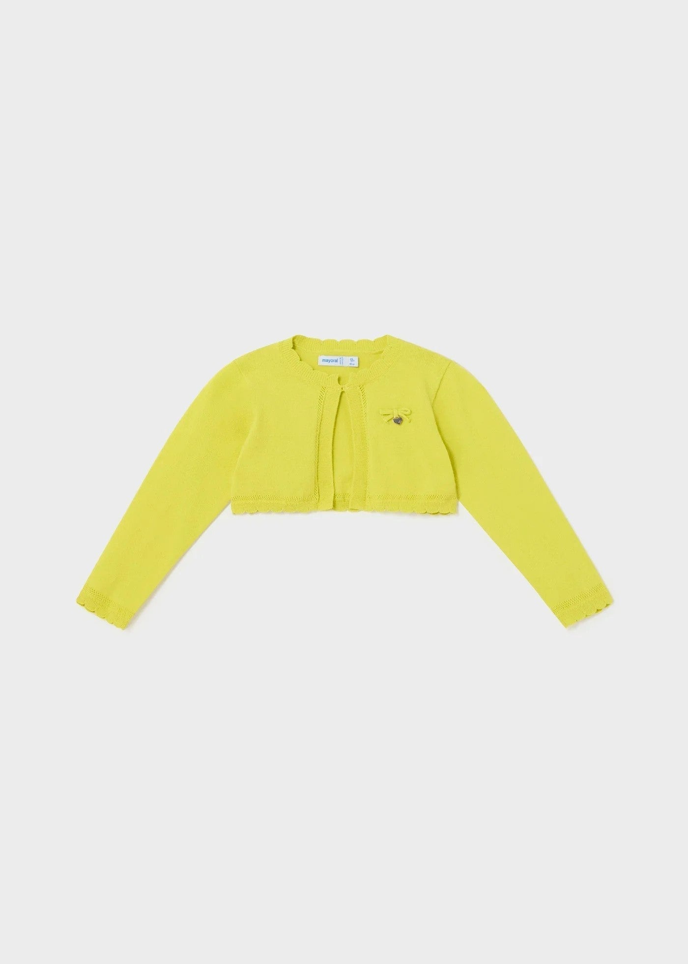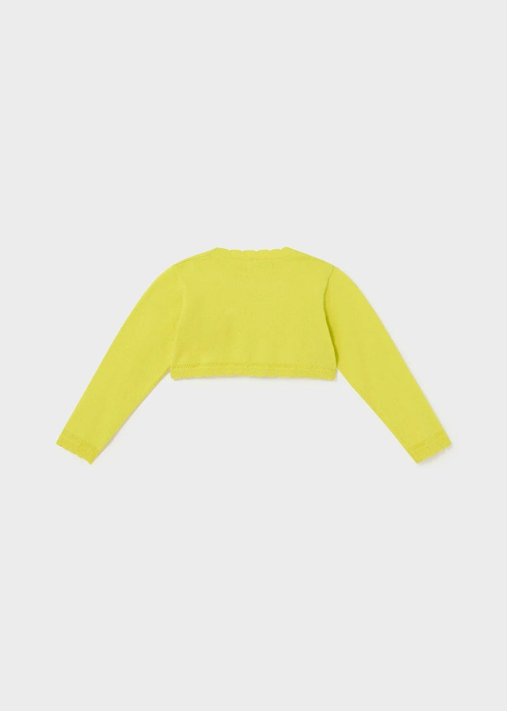 Brighten up her wardrobe with this cheerful yellow knit cardigan. Designed with a cropped silhouette, it features delicate scalloped edging, a front tie closure, and a sweet embroidered bee detail for an extra touch of charm. Lightweight yet cozy, it’s the perfect layering piece over dresses, tops, or rompers. Item 302