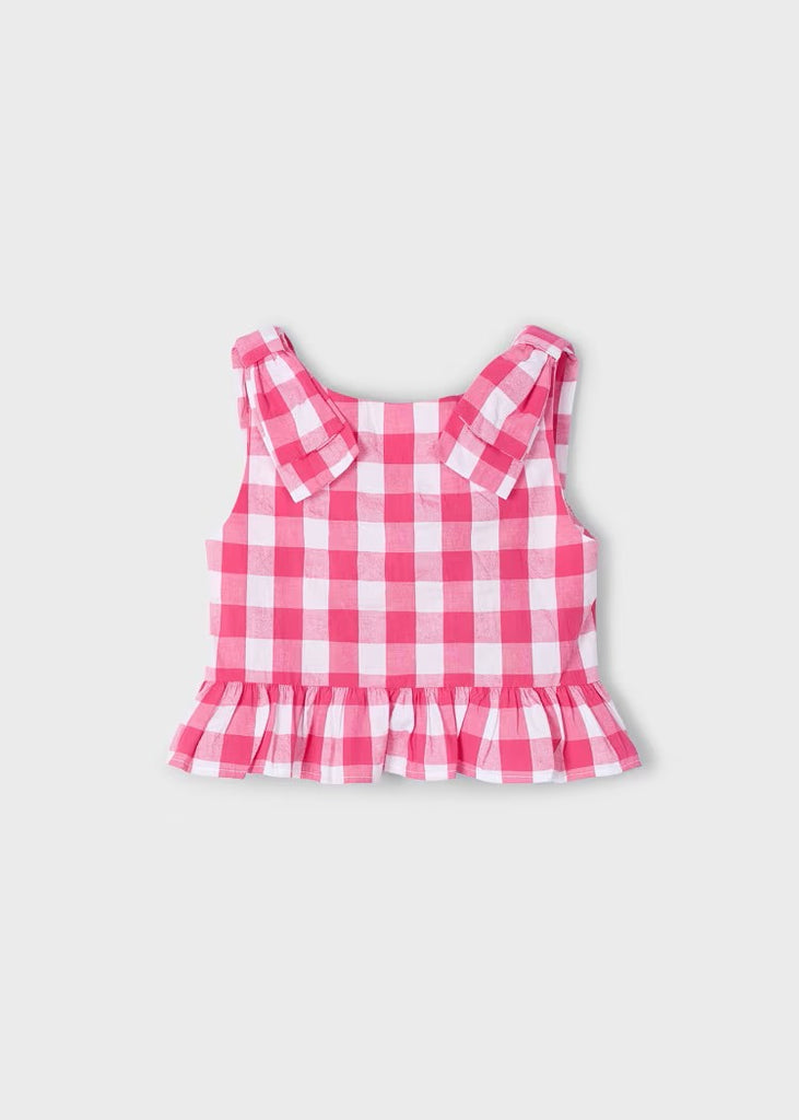 Top with straps girls. Boat neck design. Decorative elements: Smock stitch ruffled details (honeycomb knit), bow appliques.