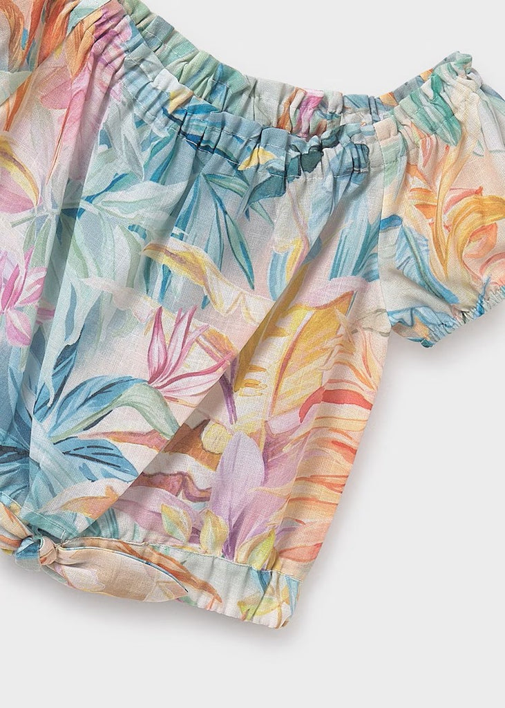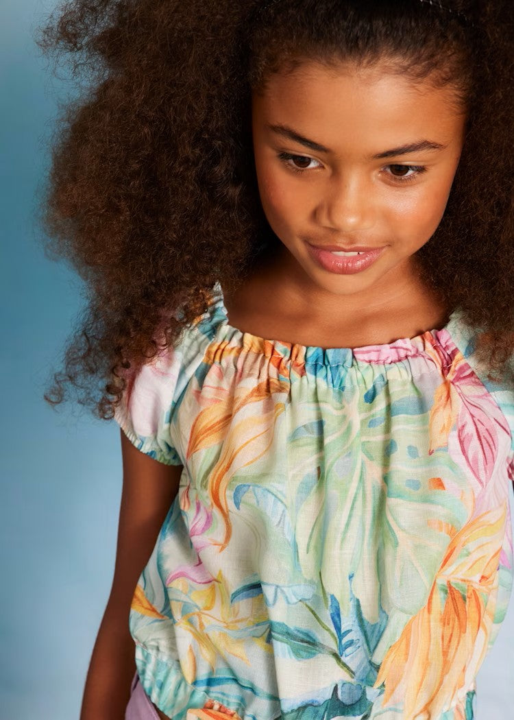This short-sleeve girls' blouse is designed with a stylish square neckline and crafted from fluid fabric for all-day comfort. Featuring a printed design and an elegant bow detail, it’s perfect for adding a touch of charm to everyday outfits. Item 6146