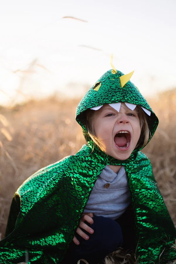 Perfectly cuddly this dragon cape is made of shiny spandex, with felt-based spikes designed to stand up on their own. The cape features a luxurious fabric with a scale dragon skin texture and is fully lined with a silky-smooth lining. The Velcro closure at the neck means this cape is easy to put on and take off. Item 53062