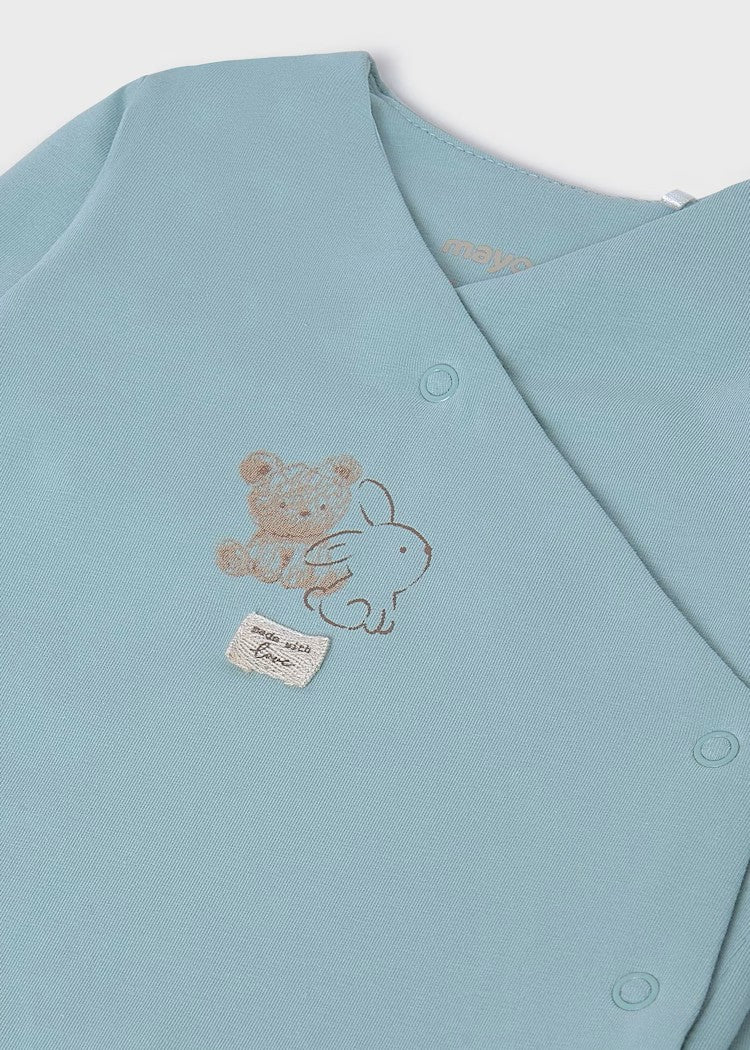 Original three-piece set for baby, combining comfort and practicality. The long-sleeve onesie features feet for added warmth, a crossover neckline, a full side opening with snap buttons, and snap closures at the crotch. This unisex design is versatile, with neutral tones and a simple shape suitable for both boys and girls. The set also includes a printed baby bib for added convenience and a sweet newborn hat with adorable ear appliqué details and a printed design, making it the perfect cozy and charming combination for your little one. Designed in Spain. Item 9907