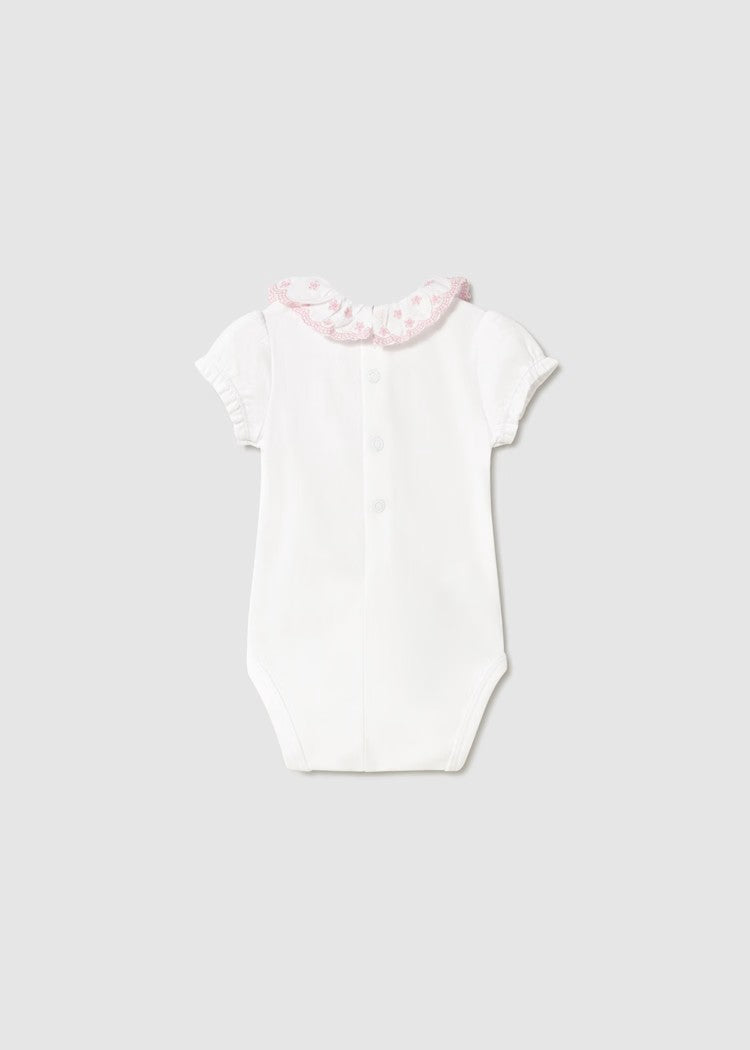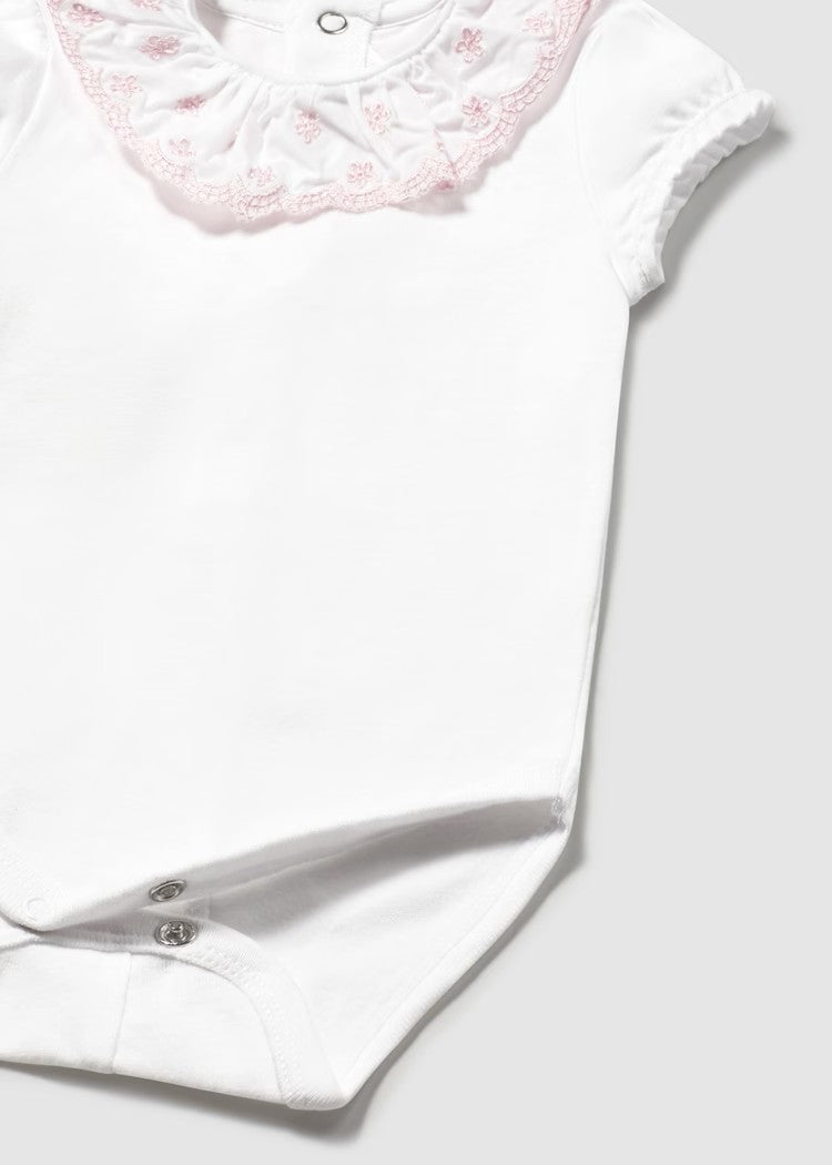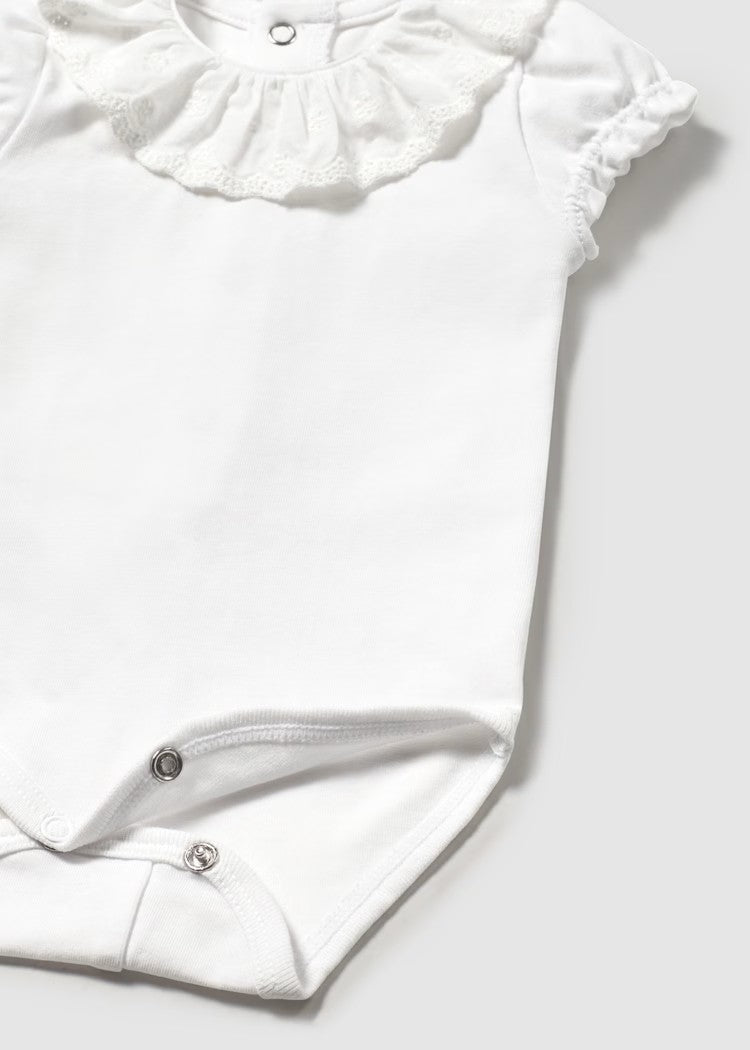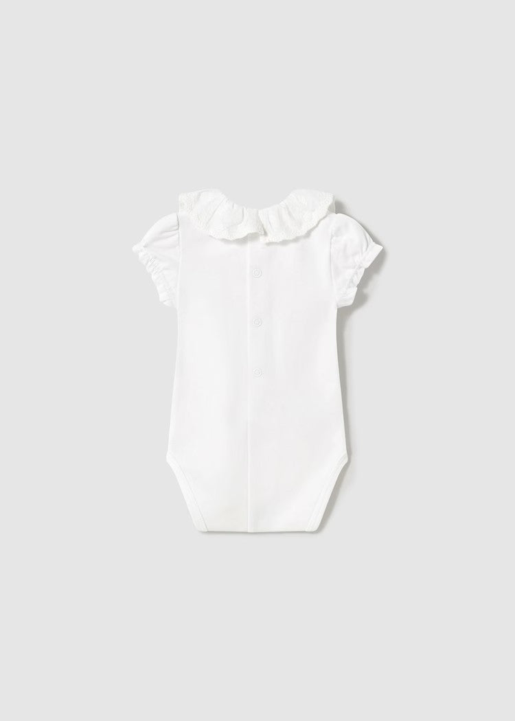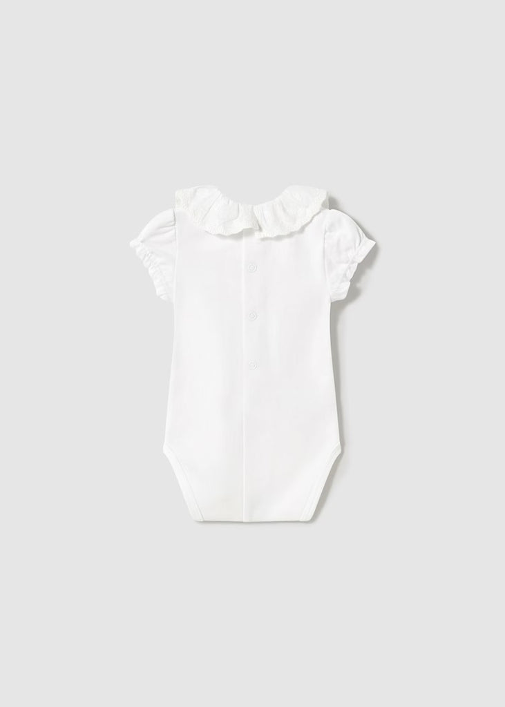 Newborn short-sleeve bodysuit with a ruffled round collar. Button closure at the back for easy dressing and snap buttons at the crotch for convenience.