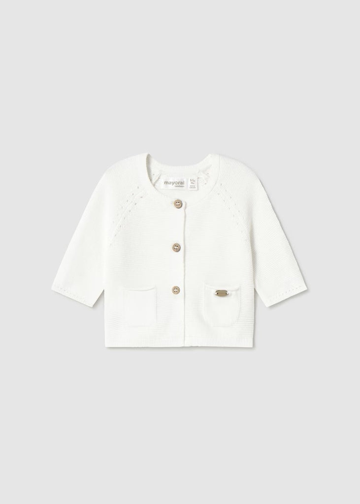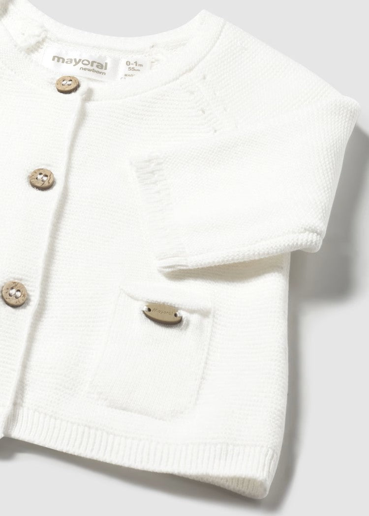 Newborn long-sleeve cardigan. Front button closure. Soft and pleasant-to-the-touch knit fabric. Functional front pockets. Item 1307