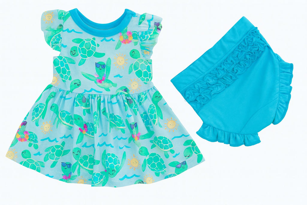 This adorable infant peplum set brings all the sunshine and sea turtle cuteness your little one needs! Featuring a flutter-sleeve peplum top and matching ruffle bloomers, it's made from our signature buttery-soft bamboo viscose blend—lightweight, breathable, and perfect for sensitive skin. The vibrant print and comfy fit make it ideal for warm days, photo ops, and tropical moments.