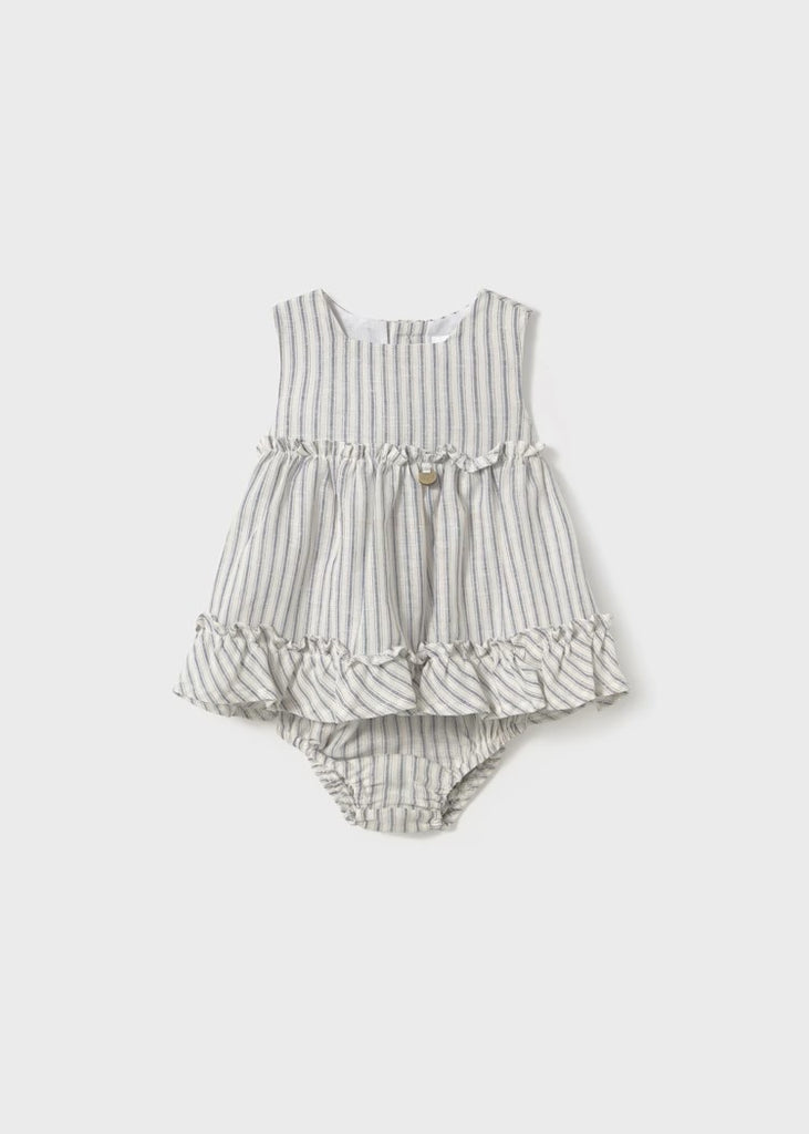 Original two-piece set for newborn girl. Sleeveless dress for newborn. Straight neckline. Button closure at the back for easy dressing. Lined model. Ruffled design. Design with a ruffle at the hem. Striped pattern. Newborn diaper cover. Elastic waistband. Item 1844