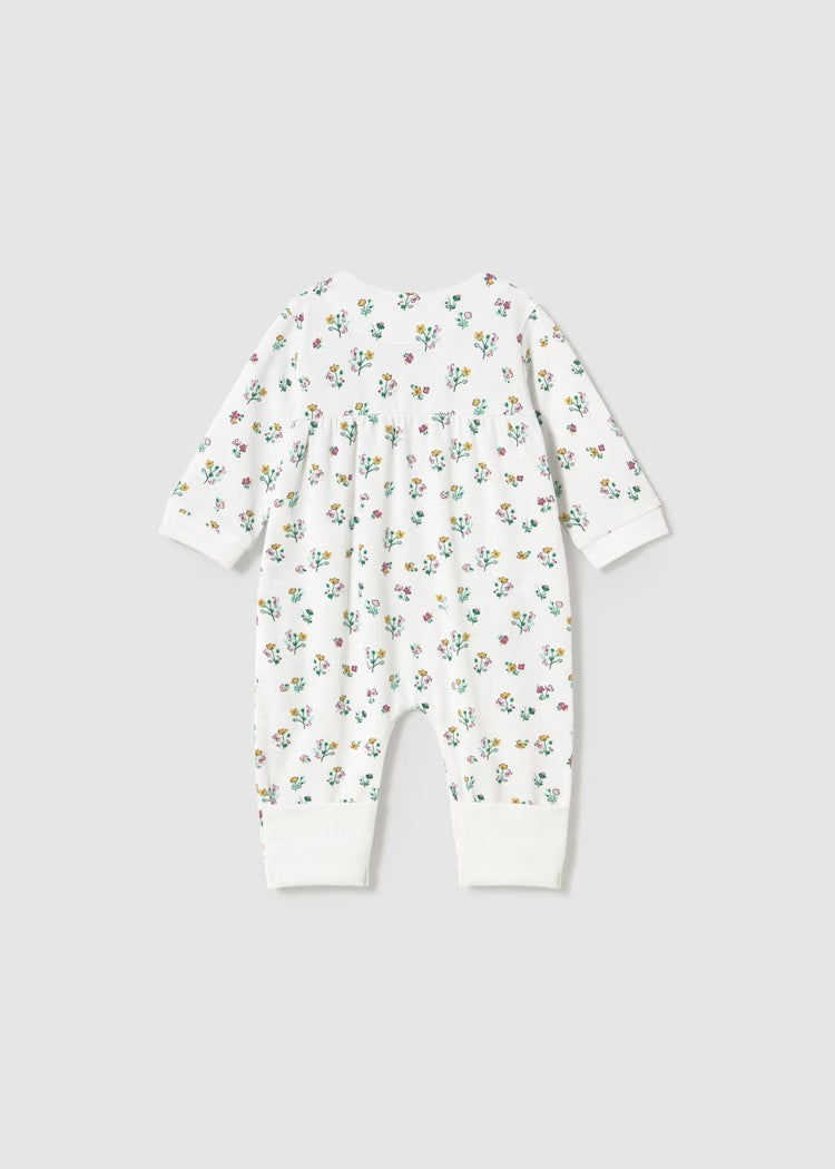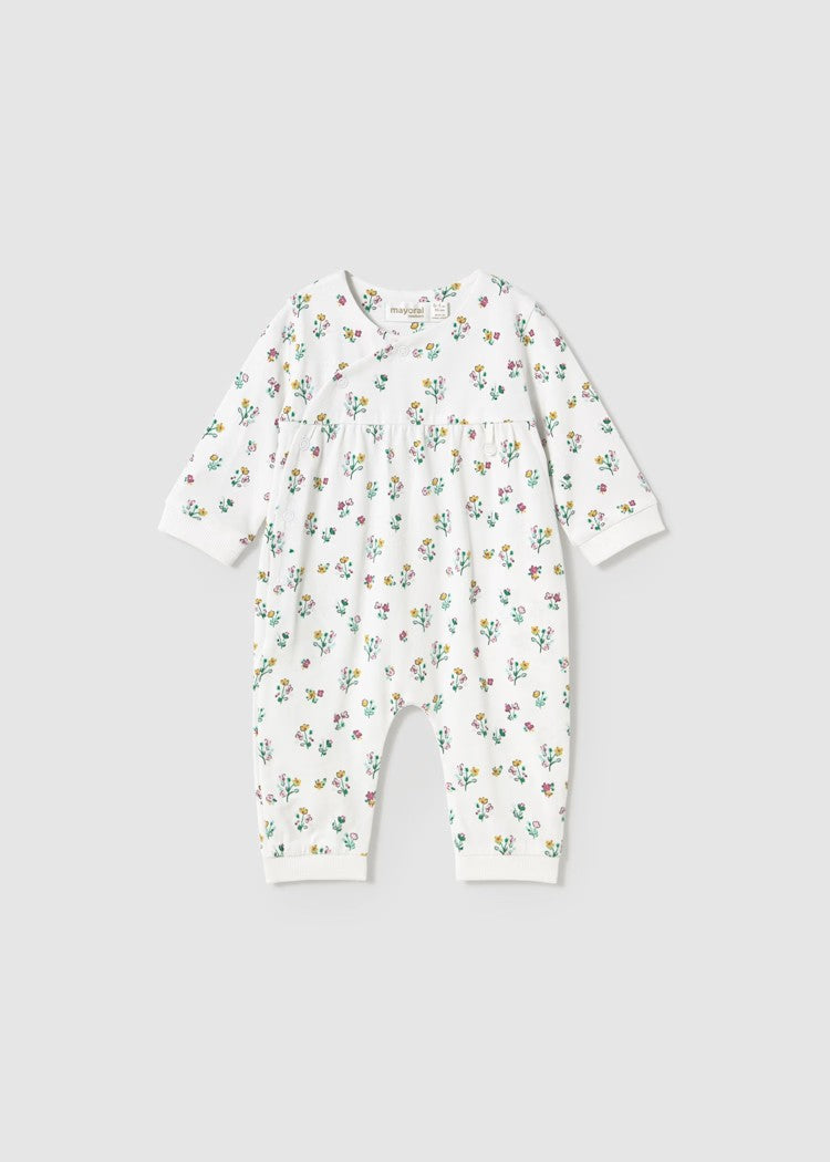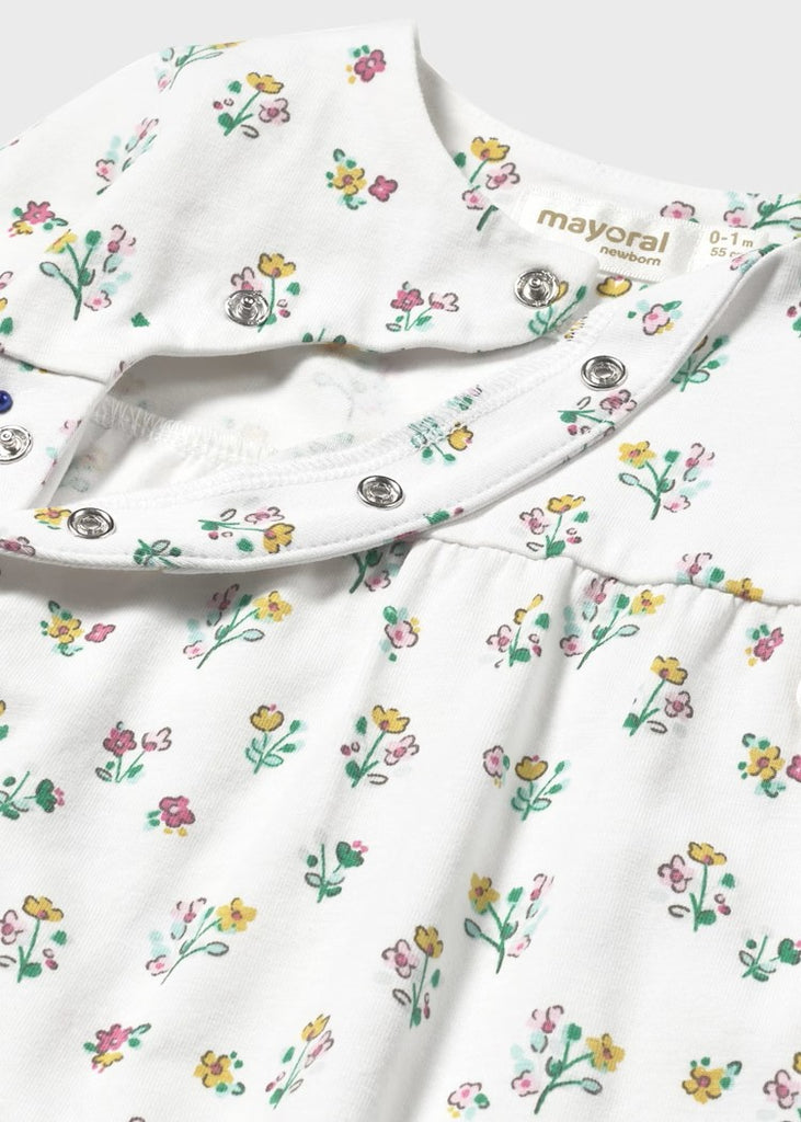 Long-sleeve one-piece for newborns with a side snap button closure. Made from soft, stretchy cotton fabric. Decorative button detailing and a floral print add a charming touch. For sizes 6-9 months to 18 months, this model features footless design to provide better mobility and added comfort for the baby. Item 1753