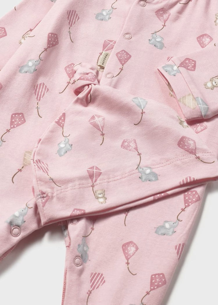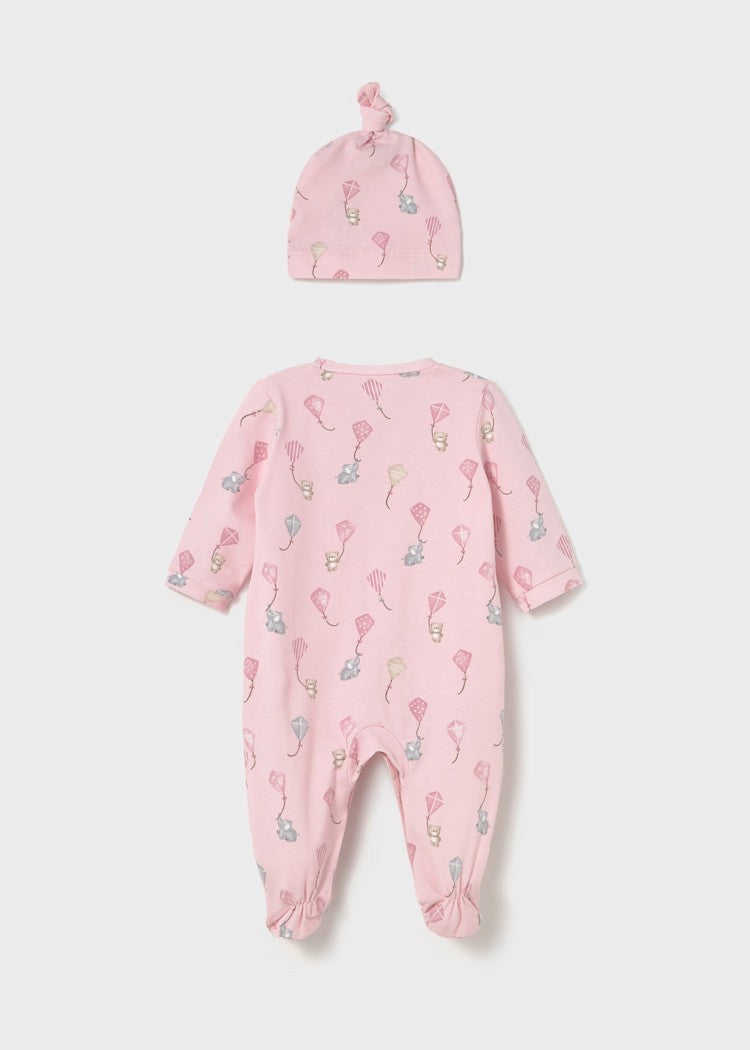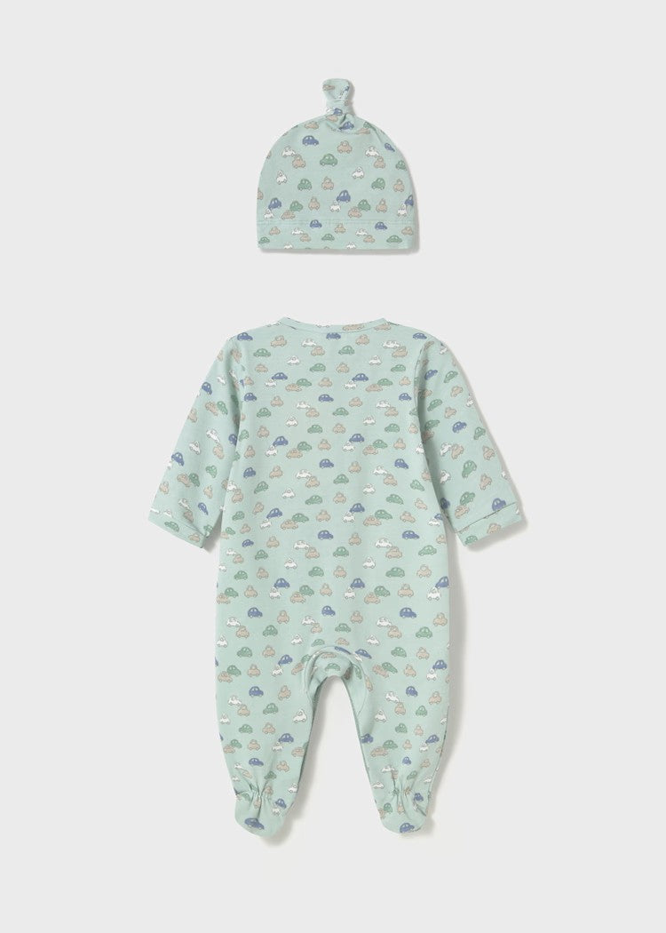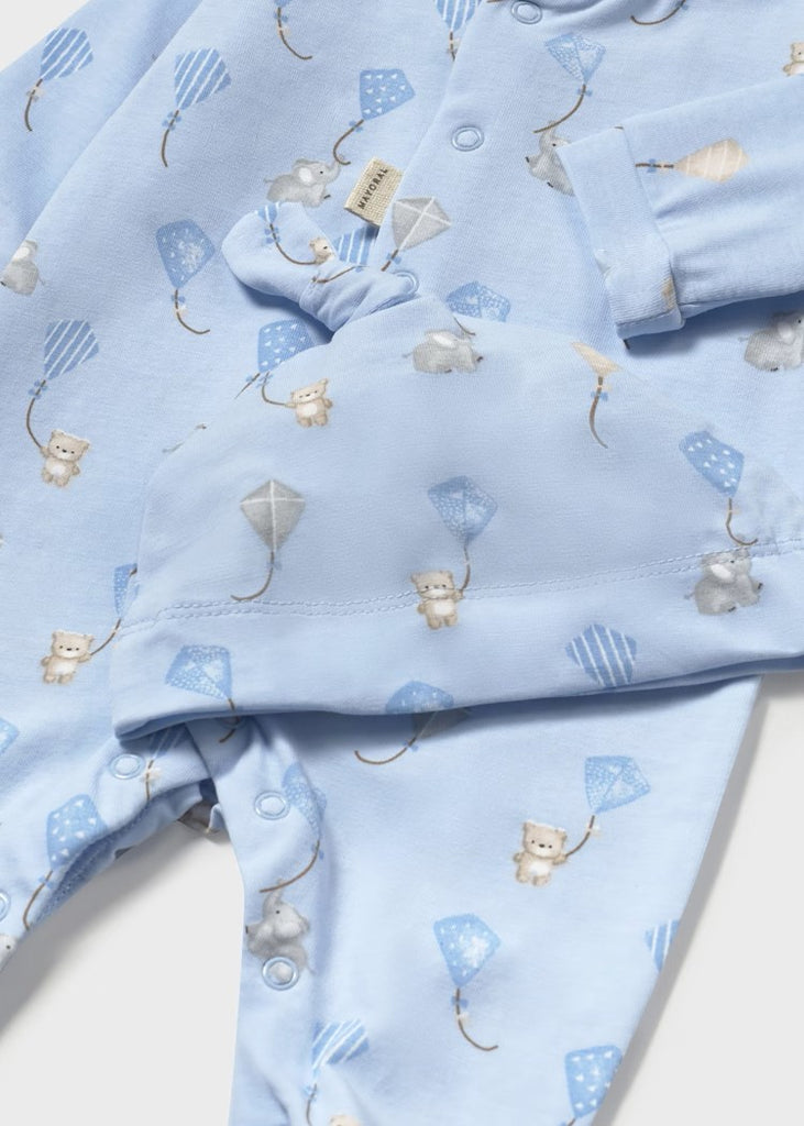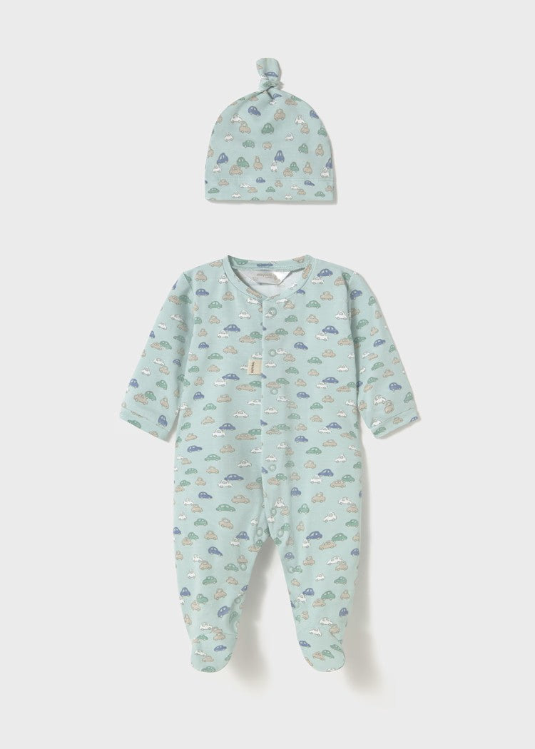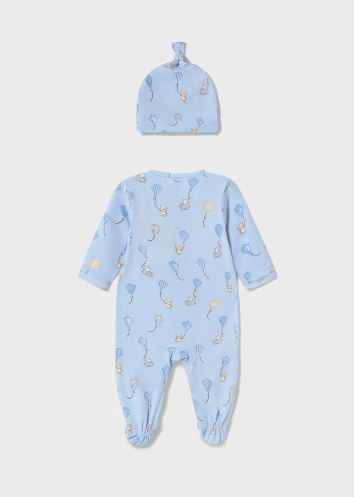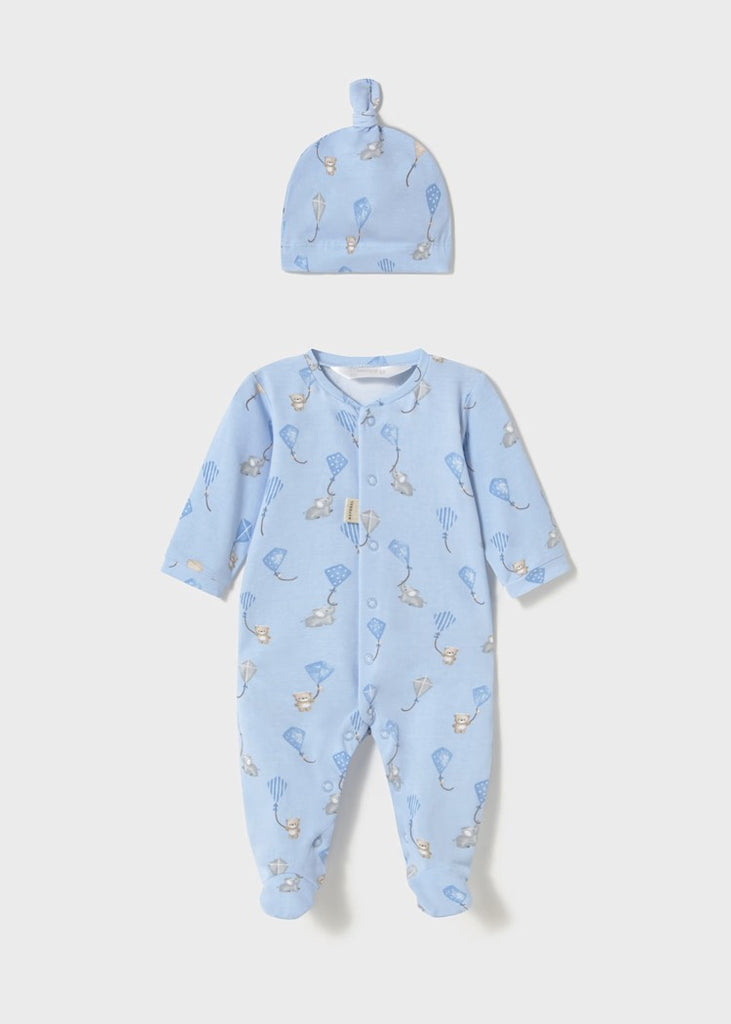 An original two-piece set for newborns. The newborn long-sleeve romper features a footed design, front button closure, and snap buttons at the crotch for easy dressing. It also has a playful printed design. For larger sizes (12 and 18 months), it includes a non-slip sole for added safety. A sweet newborn hat to complete the look. Item 1706