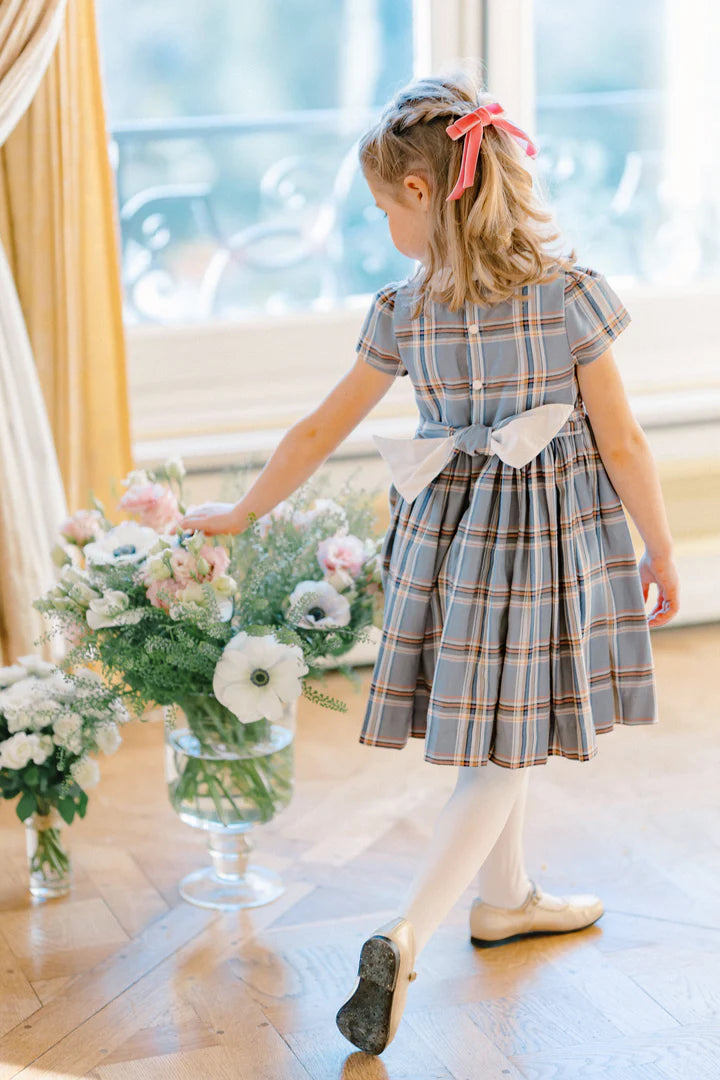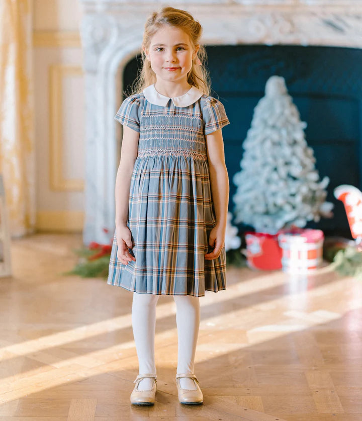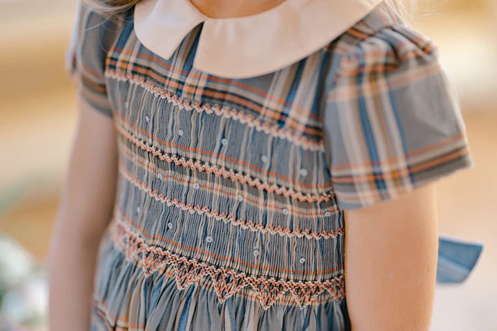 Heritage blue/pink/grey Tartan short puffed-sleeves dress with a sophisticated pink & blue hand triangle Embroidery.
