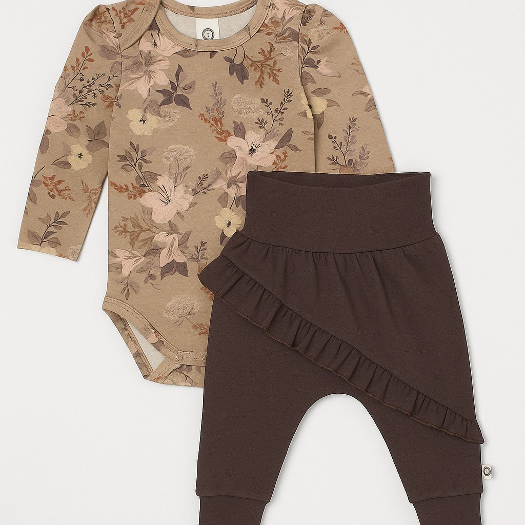 Dress your little one in timeless charm with this adorable two-piece set. The soft, long-sleeve bodysuit features a delicate floral print in warm, earthy tones—perfect for cozy autumn days. Paired with stylish deep-brown pants, complete with a playful diagonal ruffle detail, this outfit combines comfort with a touch of elegance.