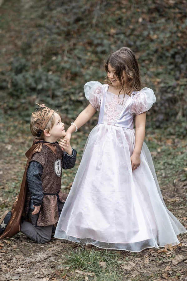 Introducing our stunning platinum princess gown for kids, fit for royalty! This enchanting dress is crafted with the utmost care and attention to detail, ensuring your little one feels like a true princess. This Princess gown features a beautiful princess silhouette with a flowing skirt and delicate embellishments. The platinum color adds a touch of elegance, making it perfect for special occasions, parties, or dress-up play. Your child will be the belle of the ball in this exquisite platinum princess gown. Item 37315