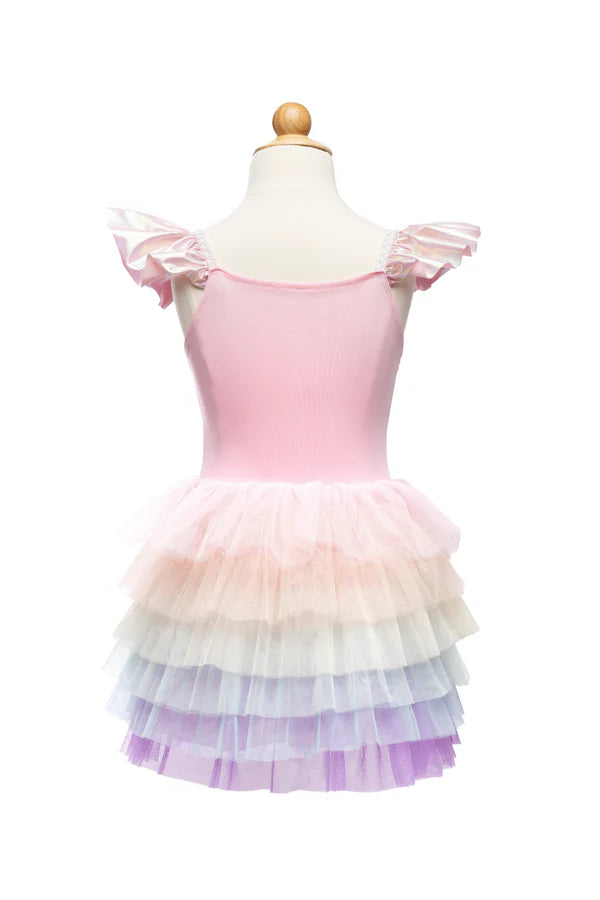 Put a smile on your little one's face with our NEW Rainbow Ruffle Tutu Dress. With a metallic iridescent spandex top and a rainbow tulle skirt made with layers of purple, blue, green, pink, and yellow tulle, this dress is sure to make your little one feel like royalty from head to toe. It's sure to be a favorite piece in their wardrobe! Item 32125