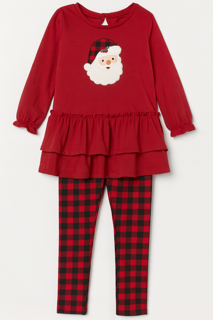 This adorable two-piece set features a ruffle-layered top with the cutest Santa appliqué and matching checkered leggings for a perfectly coordinated holiday look. Soft, comfy, and full of Christmas charm, it’s ideal for pictures, parties, and cozy winter days.