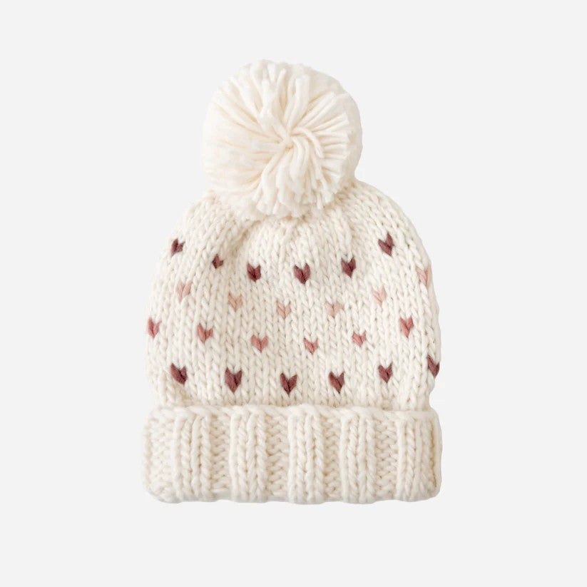 Keep it simple and sweet in our Mauve and Cream Sawyer Hat. Features tiny heart stripes in Mauve, Rose, and Blush with a Cream pom, pair with matching cardigan and mittens.