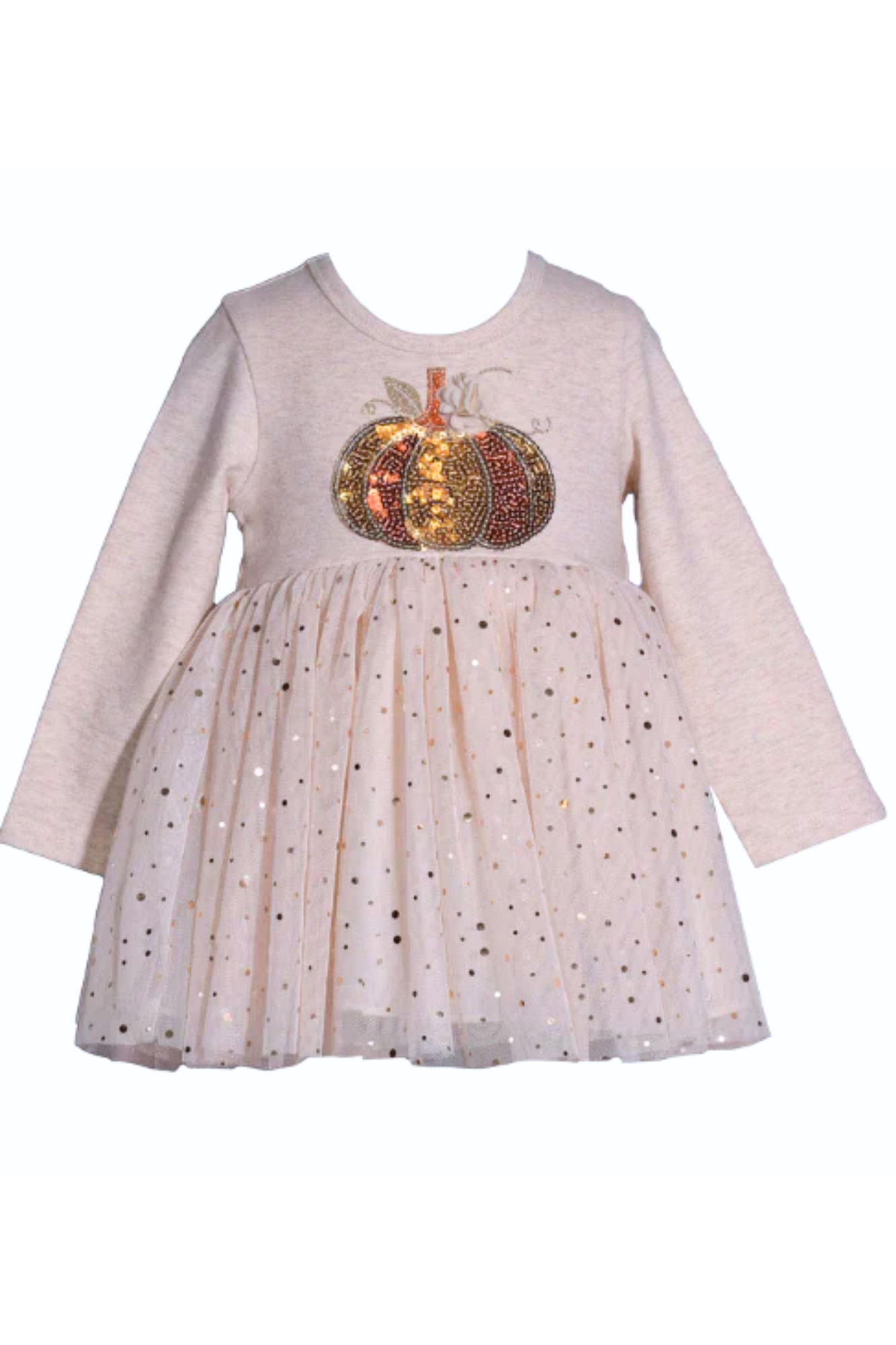 Celebrate the magic of autumn with this charming long-sleeve dress, featuring a shimmering sequin pumpkin design that captures the spirit of the season. The soft knit bodice offers cozy comfort, while the twirl-worthy tulle skirt dazzles with metallic polka dots for a touch of sparkle. Perfect for fall festivities, pumpkin patch adventures, or Thanksgiving celebrations, this dress brings comfort and style together in the sweetest way.