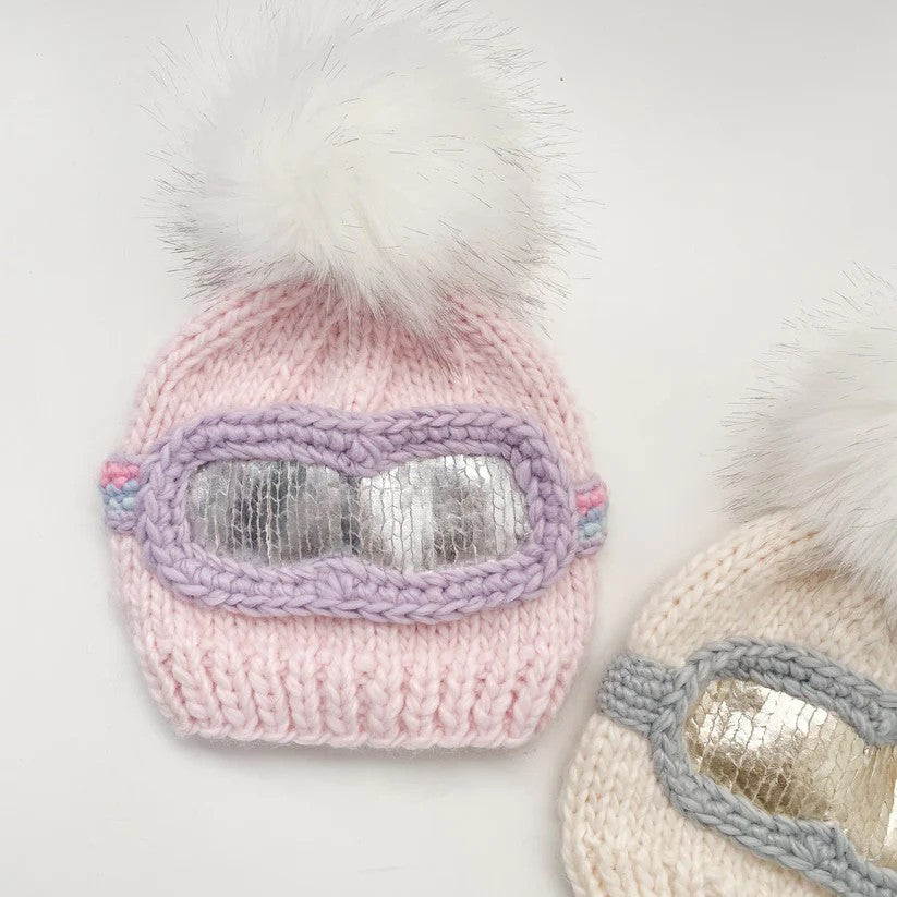 The perfect beanie for your little shredder and you! Dashing poms and popping colors in Baby Pink, Lavender, and Sky Blue with Silver metallic goggles add detail to our Classic Ski Goggle trim. Match with the Baby Pink Ski Sweater.