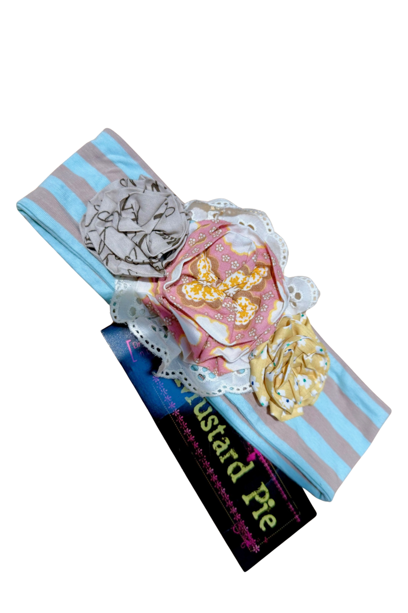 Aqua and Taupe stirpe headband with 3 fabric flowers.
